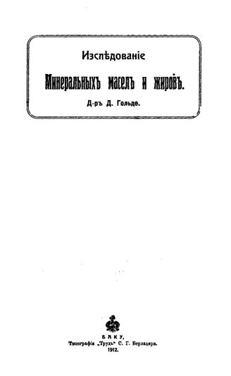Гольде Д. Исследование минеральных масел, жиров и родственных им продуктов [Электронный ресурс] : монография / Д. Гольде; пер. с 3-го испр. и доп. изд. В. Ф. Герра, В. И. Святского и Г. С. Сурабекова, под ред. А. Г. Муат, 1912. - 495 с.