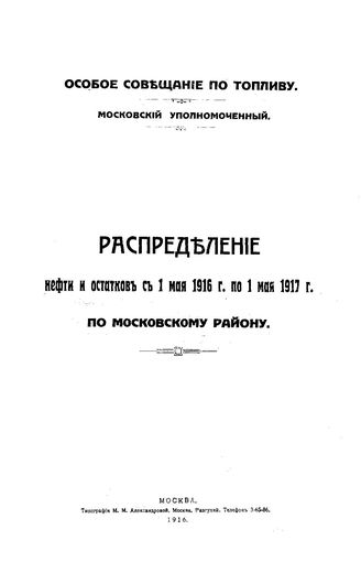 Распределение нефти и остатков с 1 мая 1916 г. по 1 мая 1917 г. по московскому району [Электронный ресурс] / Россия. Упр. делами по распределению минерального топлива, 1916. - 44 с.