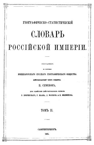 Географическо-статистический словарь Российской Империи сост. по поручению Император. рус. географ. о-ва П. Семенов при содействии В. Зверинского, Н. Филиппова, Р. Маака. Т. 2. - СПб., 1865.