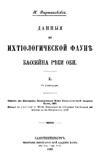 Варпаховский Н. Данные по ихтиологической фауне бассейна реки Оби : оттиск из Ежегодника Зоолог. музея Имп. АН, 1897 / Н. Варпаховский, 1897. - 31 с.