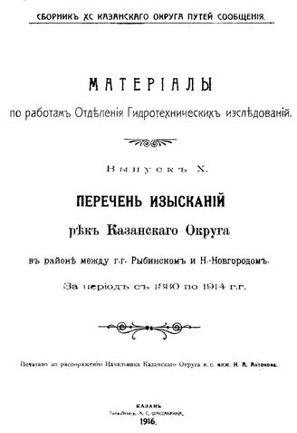 Сборник Казанского округа путей сообщения. 90 : Материалы по работам Отделения гидротехнических исследований, Вып. 10. Перечень изысканий рек Казанского округа в районе между г. г. Рыбинском и Н. Новгородом за период с 1880 по 1914 г. г.