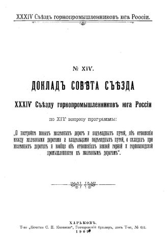 Доклад совета съезда XXXIV Съезду горнопромышленников юга России. № 14. - Харьков, 1909.