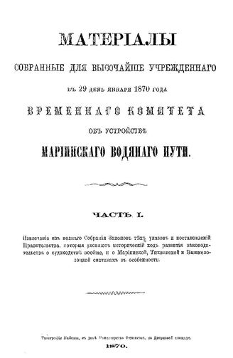Материалы, собранные для высочайше учрежденного в 29 день января 1870 года временного комитета об устройстве Мариинского водяного пути. Ч. 1. - СПб., 1870.