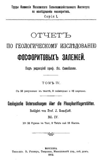 Отчет по геологическому исследованию фосфоритовых залежей / Моск. с.-х. ин-т, Комиссия по исслед. фосфоритов ; ред. Я. Самойлов. - (Труды Комиссии Московского сельскохозяйственного института по исследованию фосфоритов. Серия 1). Т. 4, 1912. - 688 с.