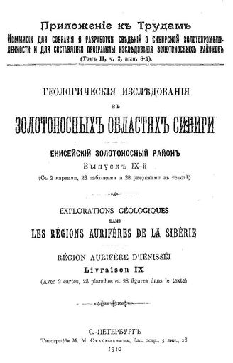Геологические исследования в золотоносных областях Сибири. Енисейский золотоносный район. Вып. 9