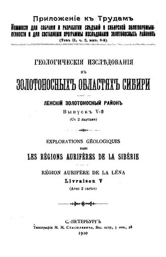 Геологические исследования в золотоносных областях Сибири. Ленский золотоносный район. - (Труды Комис. для собрания и разработки сведений о Сиб. золотопром-сти и для составления программы исслед. золотоносн. районов). Вып. 5, 1910. - 121 с.