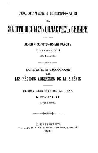 Геологические исследования в золотоносных областях Сибири. Ленский золотоносный район. - (Труды Комис. для собрания и разработки сведений о Сиб. золотопром-сти и для составления программы исслед. золотоносн. районов). Вып. 6, 1910. - 100 с.