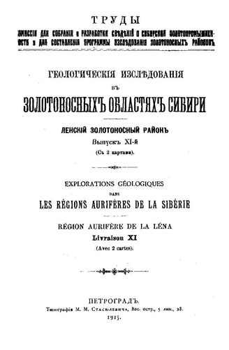 Геологические исследования в золотоносных областях Сибири. Ленский золотоносный район. - (Труды Комис. для собрания и разработки сведений о Сиб. золотопром-сти и для составления программы исслед. золотоносн. районов). Вып. 11, 1915. - 151 с.