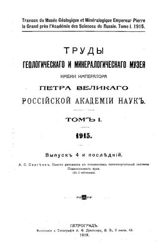 Труды Геологического и минералогического музея имени императора Петра Великого Российской академии наук / Геологический и минералогический музей им. императора Петра Великого (Петроград). Т.1(1915), вып. 4. Поиски ратовкита в отложениях каменноугольной системы Подмосковного края / А. С. Сергеев, 19. - 53.