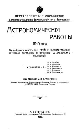 Астрономические работы Переселен. упр. Глав. упр. землеустройства и земледелия. 1910 г : в районах работ высочайше командированной Амурской экспедиции и почвенно-ботанических экспедиций. - СПб., 1913.