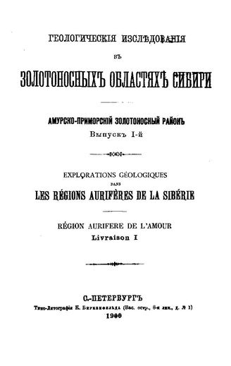 Геологические исследования в золотоносных областях Сибири. Амурско-Приморский золотоносный район. - (Труды Комис. для собрания и разработки сведений о Сиб. золотопром-сти и для составления программы исслед. золотоносн. районов). Вып. 11. - СПб., 1915.