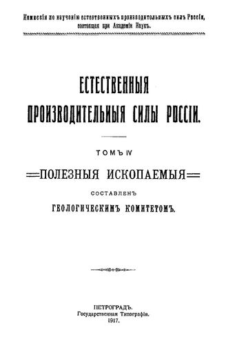Естественные производительные силы России Российская академия наук, Комиссия по изучению естественных производительных сил России. Т. 4 : Полезные ископаемые. - Петроград, 1917.