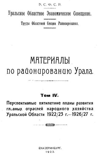 Материалы по районированию Урала : тр. обл. секции районирования / Уральское обл. экономическое совещ. Т. 4 : Перспективные пятилетние планы развития главных отраслей народного хозяйства Уральской Области 1922/23 г. - 1926/27 г., 1923. - 340 340 с.