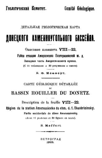 Мефферт Б. Ф. Детальная геологическая карта Донецкого каменногоугольного бассейна : описание планшета VIII-22. Район станции Амвросиевка Екатерининской Ж.Д. Западная часть Амвросиевского купола / Б.Ф. Мефферт, 1923. - 230.