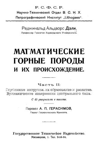 Магматические горные породы и их происхождение Р. А. Дэли. Ч. 2 : Глубинные интрузии, их образование и развитие. Вулканические извержения центрального типа. - М., 1920.