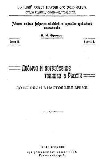 Добыча и потребление топлива в России до войны и в настоящее время В. И. Фролов. - (Работы Отдела фабрично-заводской и служебно-прикладной статистики). Вып. 1. - М., 1919.