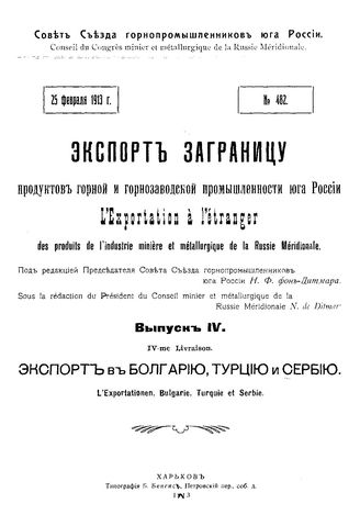 Экспорт за границу продуктов горной и горнозаводской промышленности юга России / Совет Съезда горнопромышленников юга России. Вып. 4 : Экспорт в Болгарию, Турцию и Сербию, 1913. - 72 с
