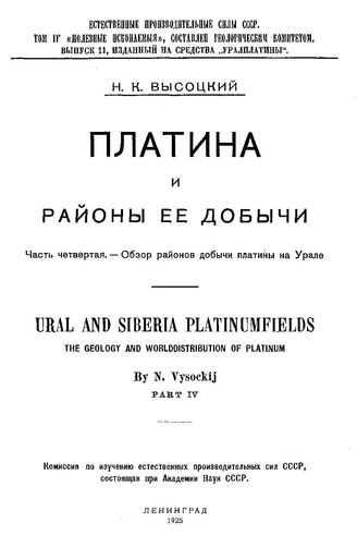 Высоцкий Н.К. Естественные производительные силы России Рос. АН, Комис. по изучению естеств. производит. сил России. Т. 4 : Полезные ископаемые, Вып. 11. Платина и районы ее добычи, Ч. 4. Обзор районов добычи платины на Урале. - Петроград, 19.