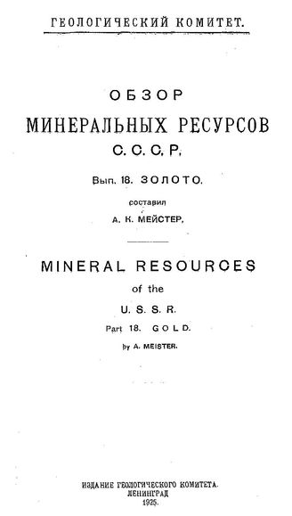 Обзор минеральных ресурсов СССР / Геологический ком. Вып. 18 : Золото / сост. А. К. Мейстер, 1925. - 48 с.