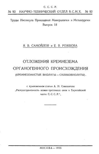 Самойлов Я.В. Труды Института прикладной минералогии и петрографии Ин-т приклад. минералогии и петрографии. Вып. 18 : Отложение кремнезема органогенного происхождения (кремнеземистые биолиты - силикобиолиты). - М., 1925.