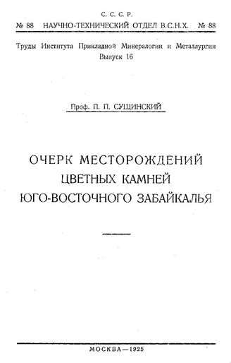 Сущинский П.П. Труды Института прикладной минералогии и петрографии Ин-т приклад. минералогии и петрографии. Вып. 16 : Очерк месторождений цветных камней Юго-Восточного Забайкалья. - М., 1925.