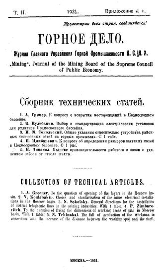 Горное дело. Журнал Главного управления Горной промышленности ВСНХ. Т. 2. Приложение 6. Сборник технический статей. - М., 1921.