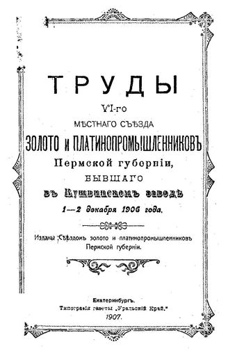 Труды VI-го местного съезда золото- и платинопромышленников Пермской губернии, бывшего в Кушвинском заводе 1-2 декабря 1906 года, 1907. - 90 с.