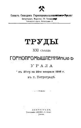 Труды XXI Съезда горнопромышленников Урала. - Петроград, 1916.