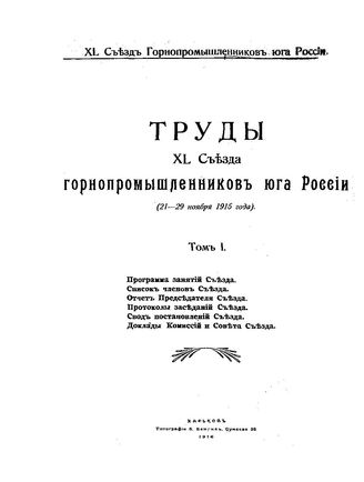 Труды XL Съезда горнопромышленников юга России : (21 - 29 ноября 1915 г.). Т. 1 : Программа занятий Съезда. Список членов Съезда. Отчет председателя Съезда. Протоколы заседаний Съезда. Свод постановлений Съезда. Доклады комиссий и совета Съезда, 1916 паг.