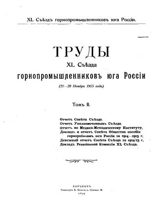 Труды XL Съезда горнопромышленников юга России : (21 - 29 ноября 1915 г.). Т. 2 : Отчет совета Съезда. Отчет уполномоченных Съезда., 1916 паг.