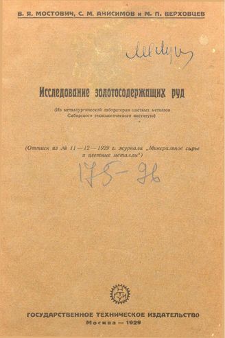 Мостович В.Я. Исследование золотосодержащих руд : из металлург. лаборатории цв. металлов Сиб. технол. ин-та / В. Я. Мостович, С. М. Анисимов, М. П. Верховцев, 1929. - 161 с.