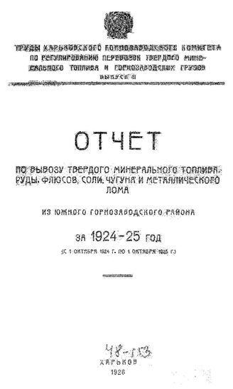 Труды Харьковского горнозаводского комитета по регулированию перевозок донецкого минерального топлива и горнозаводских грузов. Вып. 3 : Отчет по вывозу твердого минерального топлива, руды, флюсов, соли, чугуна и ...1924/25 год, 1926. - 315 с.