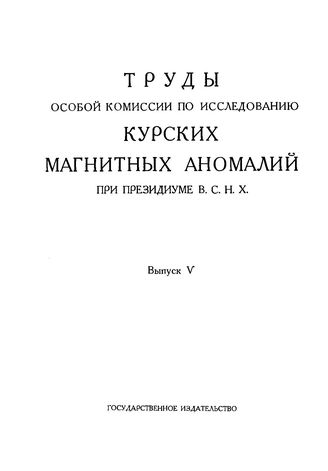 Труды Особой комиссии по исследованию курских магнитных аномалий при Президиуме ВСНХ / СССР. Высший совет народного хозяйства, Особая комис. по исследованию курских магнитных аномалий. Вып. 5 : Труды Геологического отдела, 1924. - 240 с.