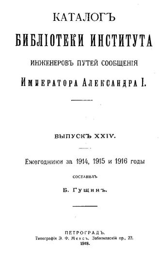 Каталог Библиотеки Института инженеров путей сообщения Императора Александра I. Вып. 24. - СПб., 1918.