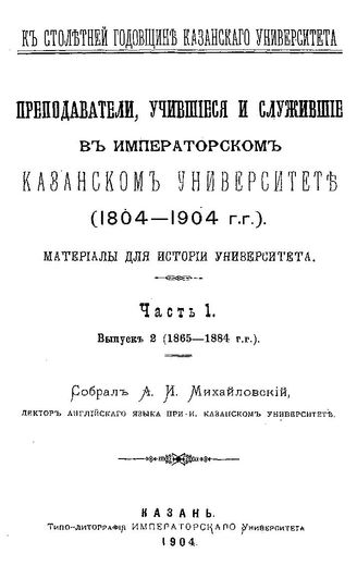 Преподаватели, учившиеся и служившие в Императорском Казанском университете : материалы для истории ун-та / собрал А. И. Михайловский. - (К столетней годовщине Казанского университета)). Ч. 1, Вып. 1. 1805-1854 гг., 19. - 426 с.