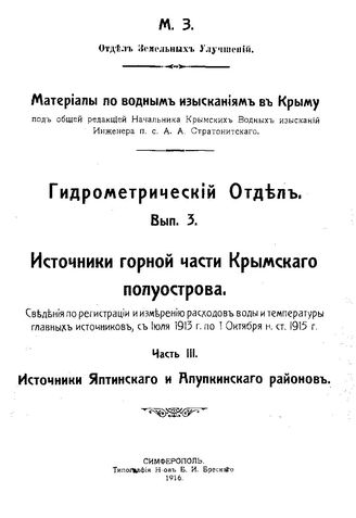 Материалы по водным изысканиям в Крыму. Гидрометрический отдел / М. З. Отд. земельных улучшений. Вып. 3 : Источники горной части Крымского полуострова : сведения по регистрации и измерению расходов воды и температуры главных источников с июля 1913 г. по 1 окт. 1915 г., Ч. 3. Источники Ялтинского и Алупкинского районов, 191. - 243 с.