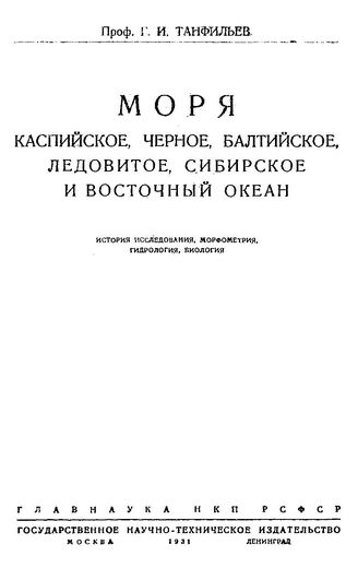 Танфильев Г.И. Моря Каспийское, Черное, Балтийское, Ледовитое, Сибирское и Восточный океан. История исследования, морфометрия, гидрология, биология / Г. И. Танфильев, 1931. - 248 с.