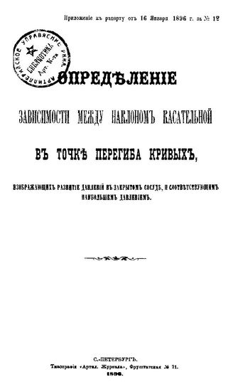 Определение зависимости между наклоном касательной в точке перегиба кривых, изображающих развитие давлений в закрытом сосуде, и соответствующим наибольшим давлением : прил. к рапорту от 16 янв. 1896 г. за № 12, 1896. - 6 с.