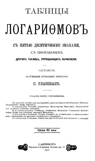 Глазенап С. Таблицы логарифмов с пятью десятизначными знаками, с приложением других таблиц, упрощающих вычисления. - СПб., 1911.
