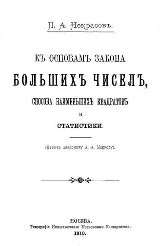 Некрасов П. А. К основам закона больших чисел, способа наименьших квадратов и статистики : ответ академику А. А. Маркову / П. А. Некрасов, 1910. - 21 с.