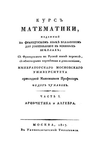 Курс математики, изданный на французском языке Беллавенем для употребления в военных школах пер. Ф. Чумаков. Ч. 1 : Арифметика и алгебра. - М., 1817.