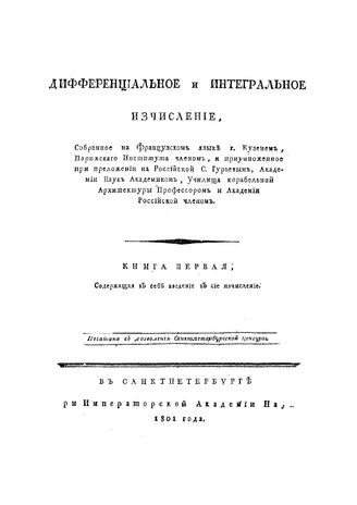 Дифференциальное и интегральное исчисление Кузень. Кн. 1 : Содержащая в себе введение в сие исчисление . - СПб., 1801.