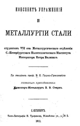 Конспект упражнений по металлургии стали студентов VII сем. Металлургического отделения С.-Петербургского Политехнического института Императора Петра Великого / сост.: Б. В. Старк по лекциям В. Е. Грум-Гржимайло, 1911. - 96 с.