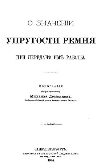 Демьянов М.Н. О значении упругости ремня при передаче им работы : второе продолж. / М. Н. Демьянов, 1894. - 182 с.