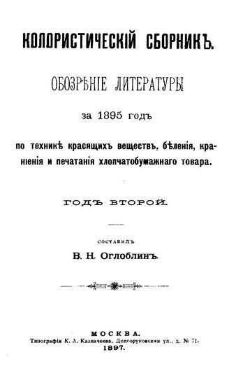 Колористический сборник : обзор литературы за 1895 год по технике красящих веществ, беления, крашения и печатания хлопчатобумажного товара : год второй / сост. В. Н. Оглоблин, 1897. - 520 520 с.