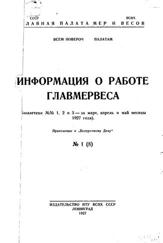 Информация о работе ГЛАВМЕРВЕСА : (бюллетень №1,2 и 3 - за март, аперль и май месяцы 1927 года) / Главная палата мер и весов, 1927. - 68.