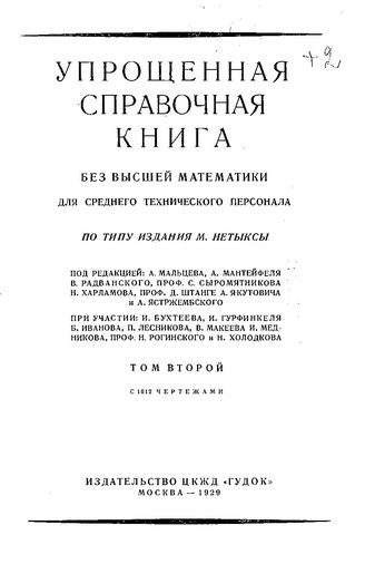 Упрощенная справочная книга под ред. А. Мальцева, А. Мантейфеля, В. Радванского, проф. С. Сыромятникова, Н. Харламова, проф. Д. Штанге, А. Якутовича и А. Ястржембского. Том второй : С 1012 чертежами. - М., 1929.