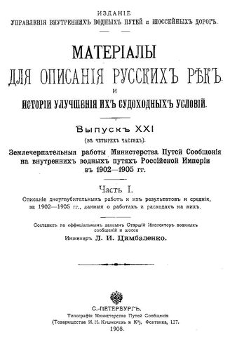 Материалы для описания русских рек и истории улучшения их судоходных условий [Электронный ресурс]. Вып. 21 : Землечерпательные работы Министерства путей сообщения на внутренних водных путях Российской Империи в 1902-1905 гг., Ч. 1. Описание дноуглубительных работ и их результатов и средние, за 1902-1905 гг., данные о работах и расходах на них, 1908. - IX,363 с.