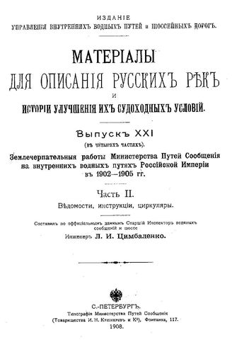 Цимбаленко Л.И. Материалы для описания русских рек и истории улучшения их судоходных условий Россия. Вып. 21 : Землечерпательные работы Министерства путей сообщения на внутренних водных путях Российской Империи в 1902-1905 гг., Ч. 2. Ведомости......