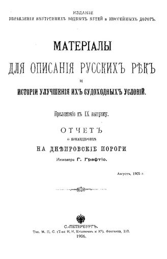 Графтио Г. Материалы для описания русских рек и истории улучшения их судоходных условий. Прил. к вып. 9 : Отчет о командировке на Днепровсие пороги. - СПб., 1905.